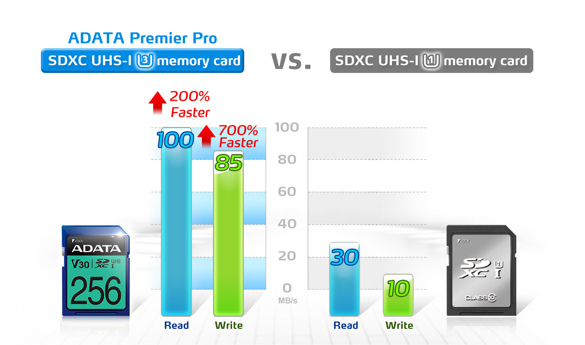 The Premier Pro series of SDXC UHS-I U3 memory cards delivers enhanced performance with read/write speeds up to 100/85MB/s, allowing the capture of high definition images and videos, including burst mode photography.