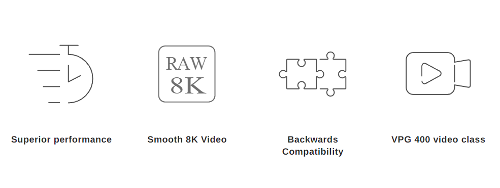 Featuring PCIe Gen 3x2 and NVMe high-speed protocols, capture the highest quality RAW, ProRes, and 8K video with ease. And with write speed of up to 1700MB/s*1, this card enables seamless and sustainable performance when content is written to the card. This card also supports VPG 400 specification for professional-quality video. This means the card’s been tested and guaranteed for professional video capture streams at a minimum guaranteed write speed of 400MB/s*1 for compatible host devices and recording media.