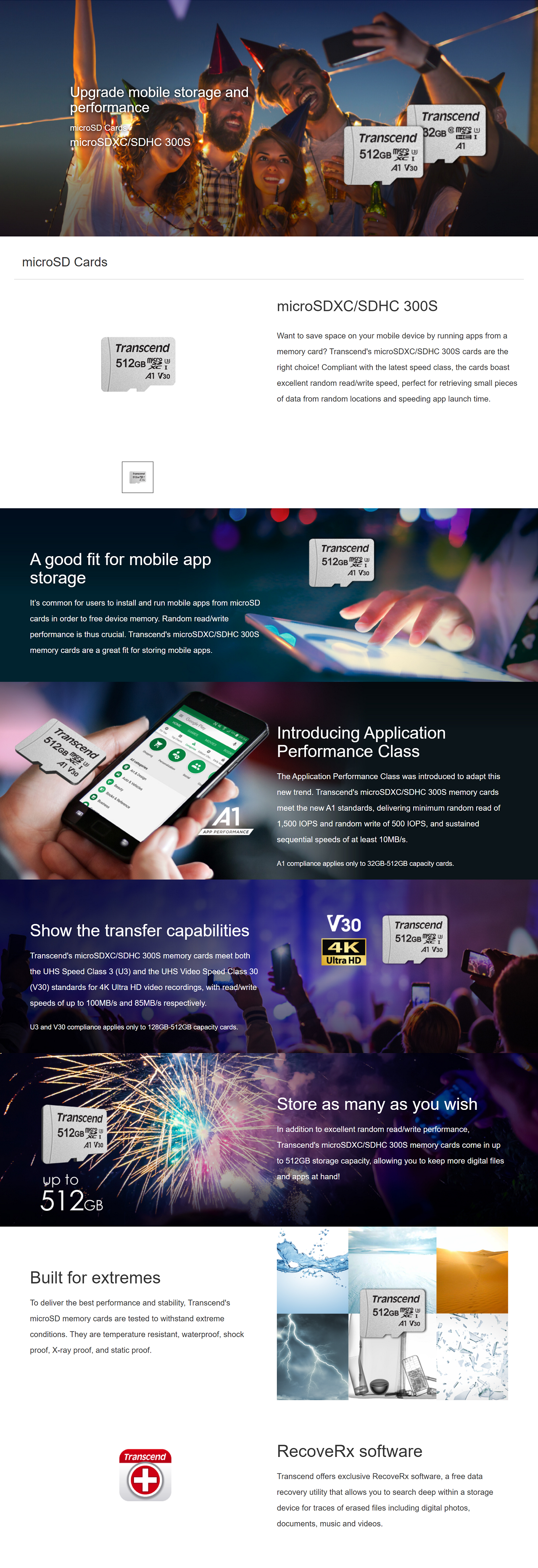 Transcend's microSDXC 300S cards are the right choice! Compliant with the latest speed class, the cards boast excellent random read/write speed, perfect for retrieving small pieces of data from random locations and speeding app.