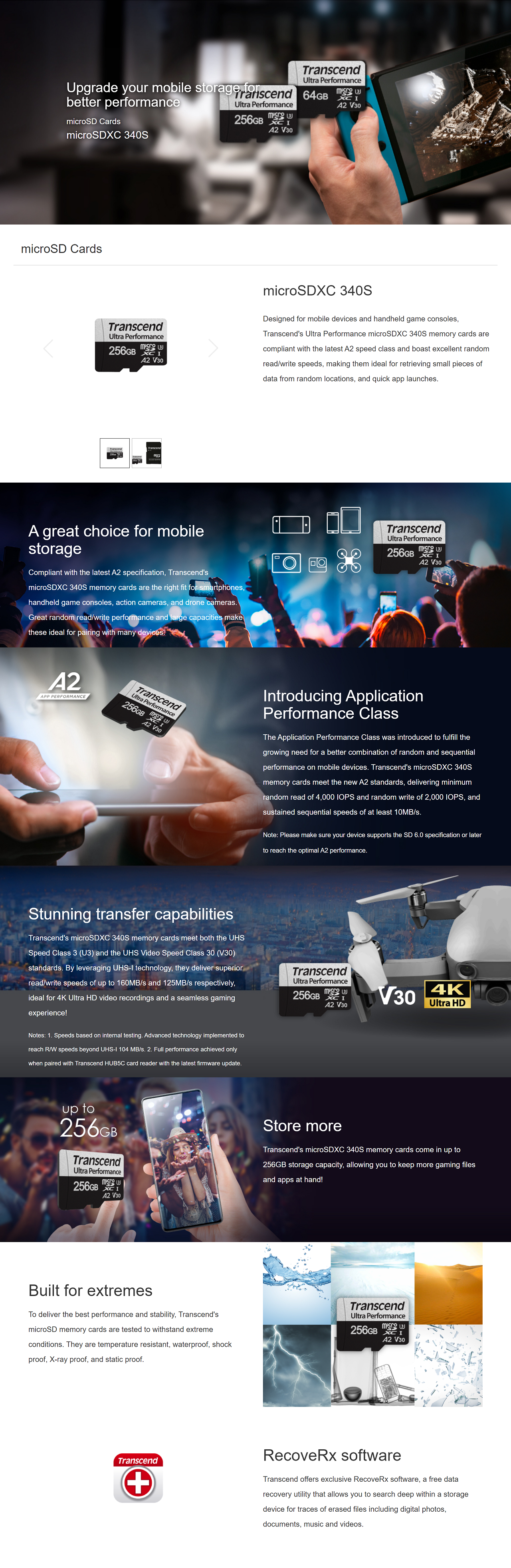 Designed for mobile devices and handheld game consoles, Transcend's Ultra Performance microSDXC 340S memory cards are compliant with the latest A2 speed class and boast excellent random read/write speeds, making them ideal for retrieving small pieces of data from random locations.