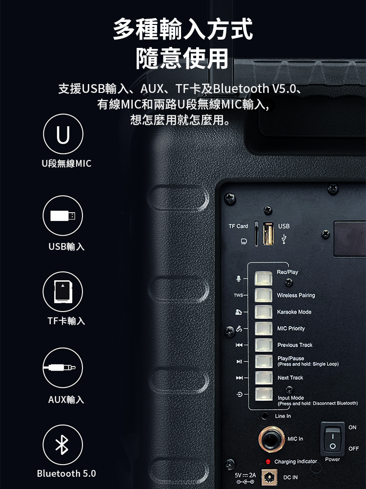 - 多種輸入 Bluetooth / AUX / USB / TF Card