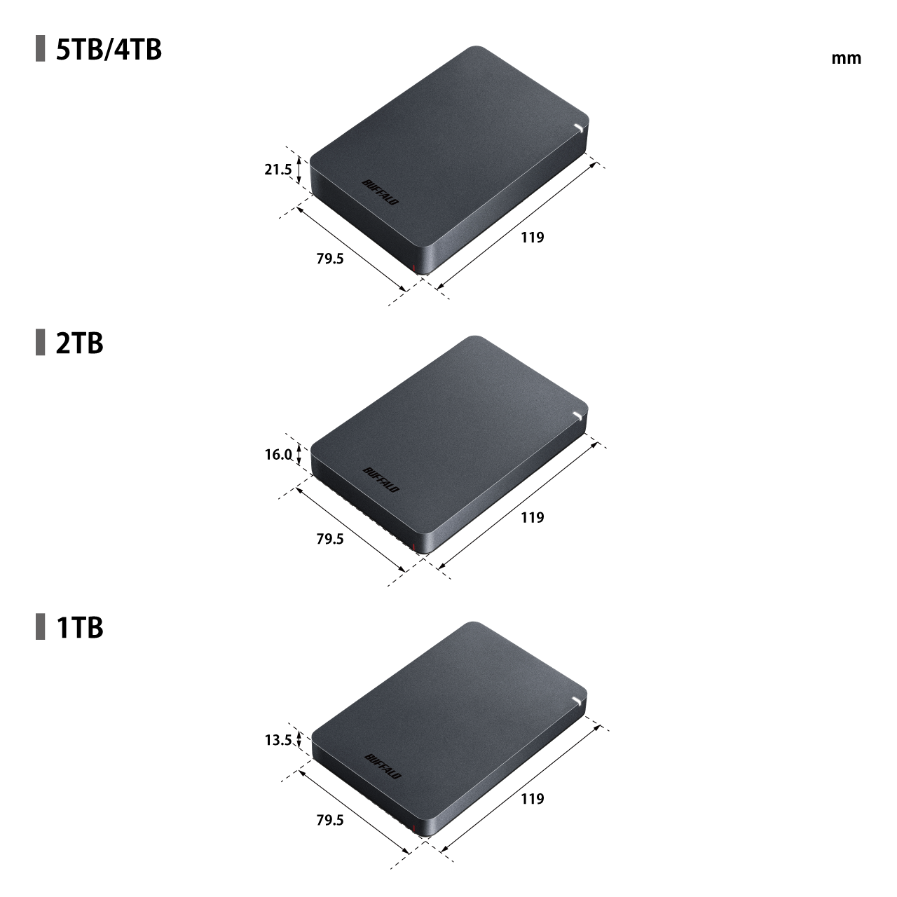 Dimensions : 1 TB : 79.5 x 119 x 13.5 mm / 2 TB : 79.5 x 119 x 16 mm / 4 TB, 5 TB : 79.5 x 119 x 21.5 mm