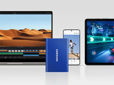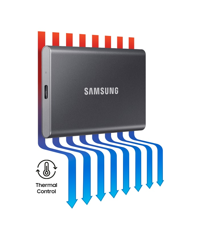 Use T7 without worrying about overheating. The T7's advanced thermal solution uses the Dynamic Thermal Guard to withstand and control heat, so the compact SSD stays at an optimal temperature even at fast speeds.