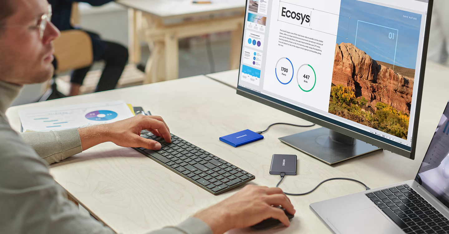 Bundled with USB Type C-to-C and Type C-to-A cables for added convenience, the T7 minimizes disruption, letting users switch seamlessly between Windows®,
