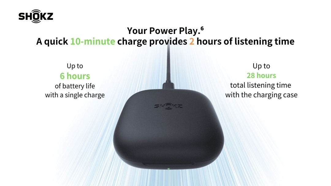 - This data was gathered at the Shokz Lab in a temperature-controlled environment of 25±2 °C, playing ACC-encoded audio at a 50% volume and all other features set to default. The actual battery life depends on the volume, sound source, degree of environmental interference, product features, use habits, and other factors. Quick charging requires the charging case to be in the green light prompt state.