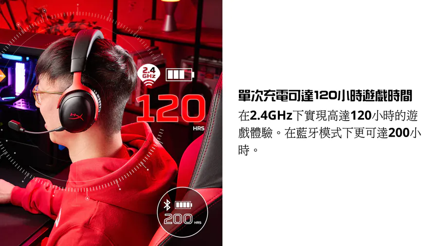 •	2.4GHz 模式下遊戲時間最長可達 120 小時。藍牙模式下,遊戲時間更可延長至 200 小時[
