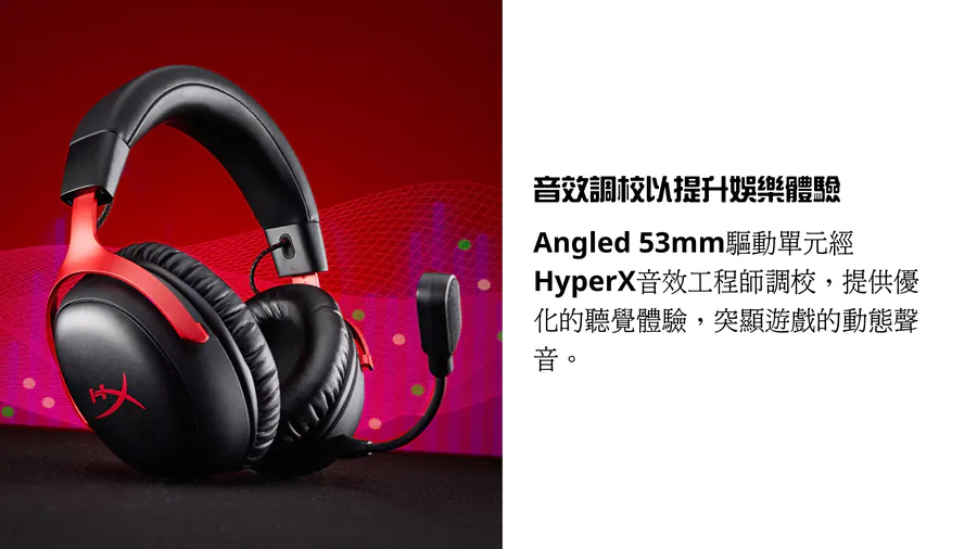 •	HyperX 音訊工程師對傾斜的 53 毫米驅動器進行了調整,以提供最佳化的聆聽體驗,突出遊戲的動態聲音。