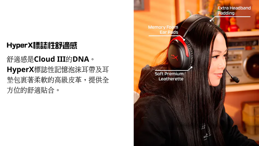 •	HyperX Signature Comfort - 舒適是 Cloud III 的基因。頭帶採用 HyperX 標誌性記憶海綿,耳墊則包覆著柔軟的優質人造皮革,帶來舒適貼合的配戴體驗。