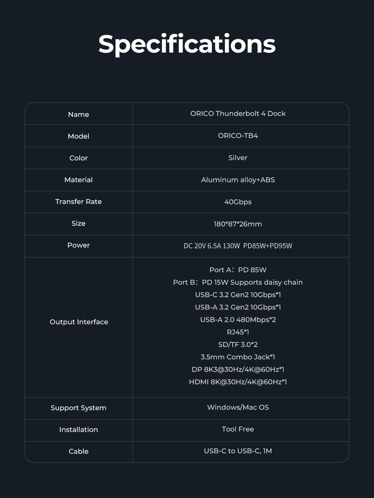Transmission Interface : PD85W TBT4 Port*1, PD 15W TBT4 Port*1, USB-C 3.2 Gen2 10G*1, USB-A 3.2 Gen2 10G*1, USB-A 2.0 480M*2, RJ45*1, SD3.0 Slot*1, TF3.0 Slot*1, 3.5mm Mic/Headset Jack*1, DP 1.4*1, HDMI 2.0*1