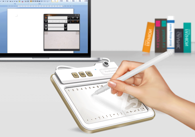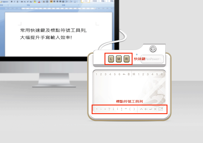 手寫板書寫區域設有多功能快選圖紙,手寫時只需點選候選字、快速輸入常用標點符號與輕鬆換行,還可將您常用的鍵盤功能,設定在手寫板上方的三個按鍵上,大幅提昇手寫輸入效率。