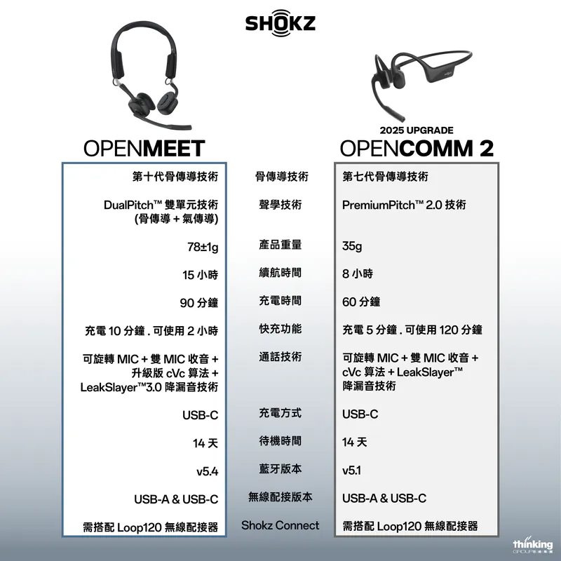 Shokz OpenMeet UC 開放式藍牙通訊耳機採用品牌標誌性的開放式耳機設計,徹底解決傳統入耳式及耳罩式耳機所帶來的不適與悶熱,提供全天候的舒適聆聽體驗。配備長達 15 小時的電池續航力與快速充電功能,並搭載DualPitch™ 雙單元技術以呈現卓越音質。此外,雙MIC 系統有效降噪,降噪率高達 98.6%,即使身處繁忙環境,也能保持清晰溝通。