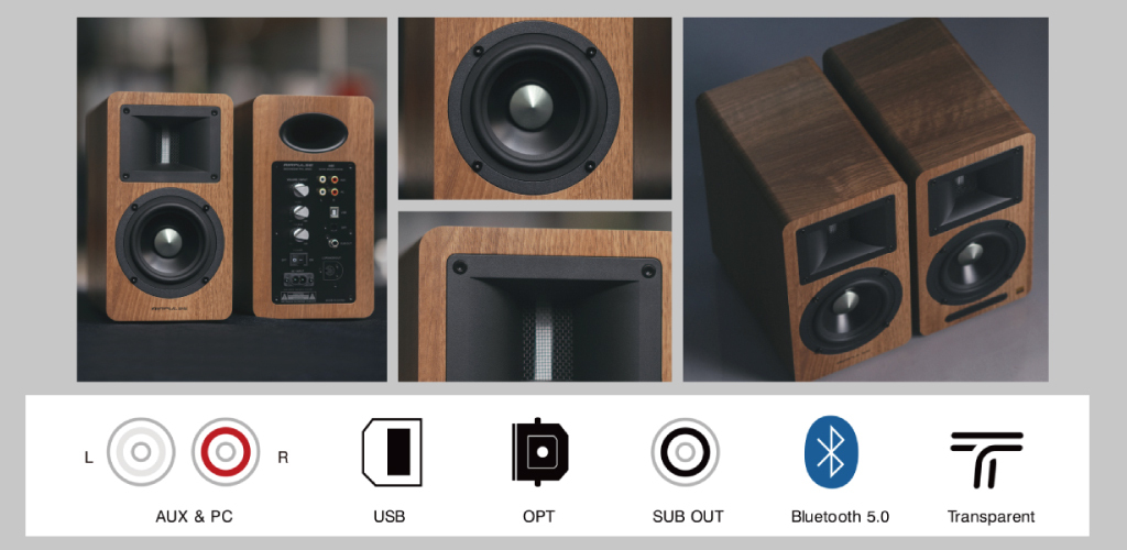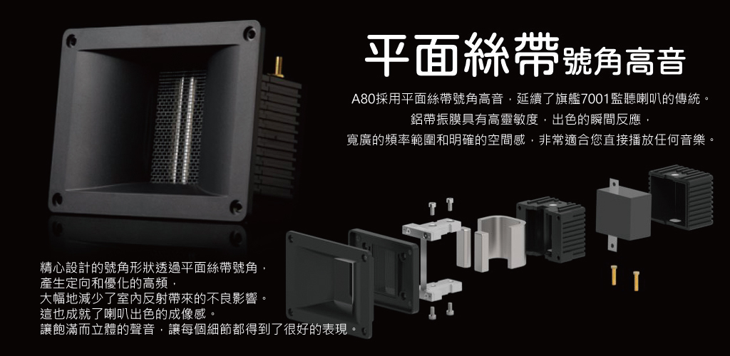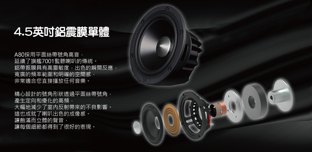 - 獨特的號角負載鋁帶高音,4.5吋鋁質振膜低失真中低音單體,為聲音提供有力保證