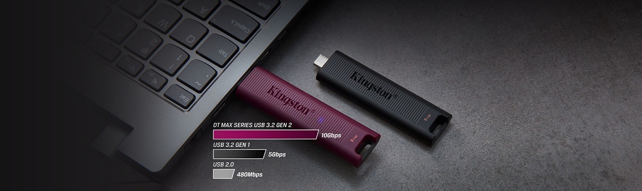 Kingston’s DataTraveler® Max series USB flash drives leverage the latest USB 3.2 Gen 2 standard to deliver record-breaking read/write speeds up to 1,000/900MB/s*2 . Designed with portability and convenience in mind, the unique ridged casing protects the connector when not in use and is easily moved with a single motion. Available in USB Type-C®*1 and Type-A connections to support next-gen and traditional laptops and desktops. The DT Max series delivers premium performance and expanded capacities up to 1TB*3 making them the ideal solution for transferring and storing large digital files such as HD photos, 4K/8K videos, music and more.