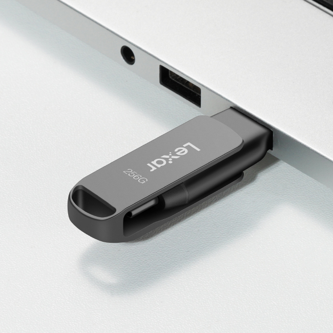 The Lexar® JumpDrive® Dual Drive D400 USB 3.1 Type-C is a 2-in-1 flash drive that allows you to seamlessly transfer content between your USB Type-C and Type-A devices. Featuring a stylish metal casing and swivel design for added protection, this drive is as tough as it is fast with transfer speeds up to 130MB/s*1.