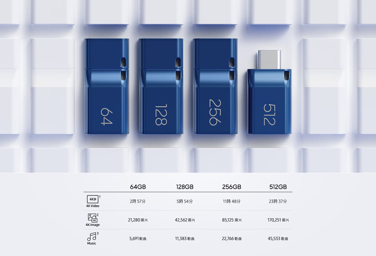 容量 : 64GB / 128GB / 256GB / 512GB  (1GB=1,000,000,000 字節)