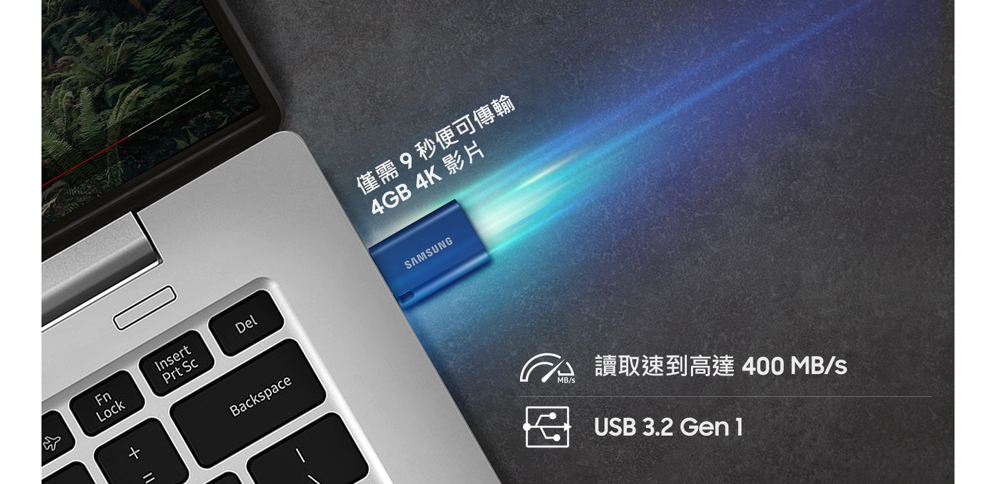 通過 USB 3.2 Gen 1 接口提供高達 400 MB/s 的連續讀取速度,僅需 9 秒即可傳輸 4GB 文件。