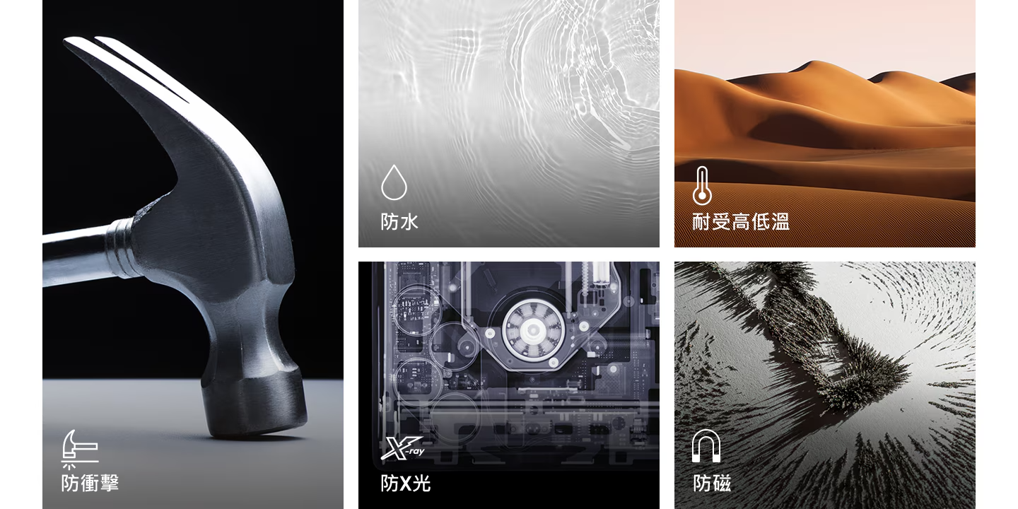 保護重要資料免受水、極端溫度、X 光、磁場和震動的影響,非常適合隨身攜帶。