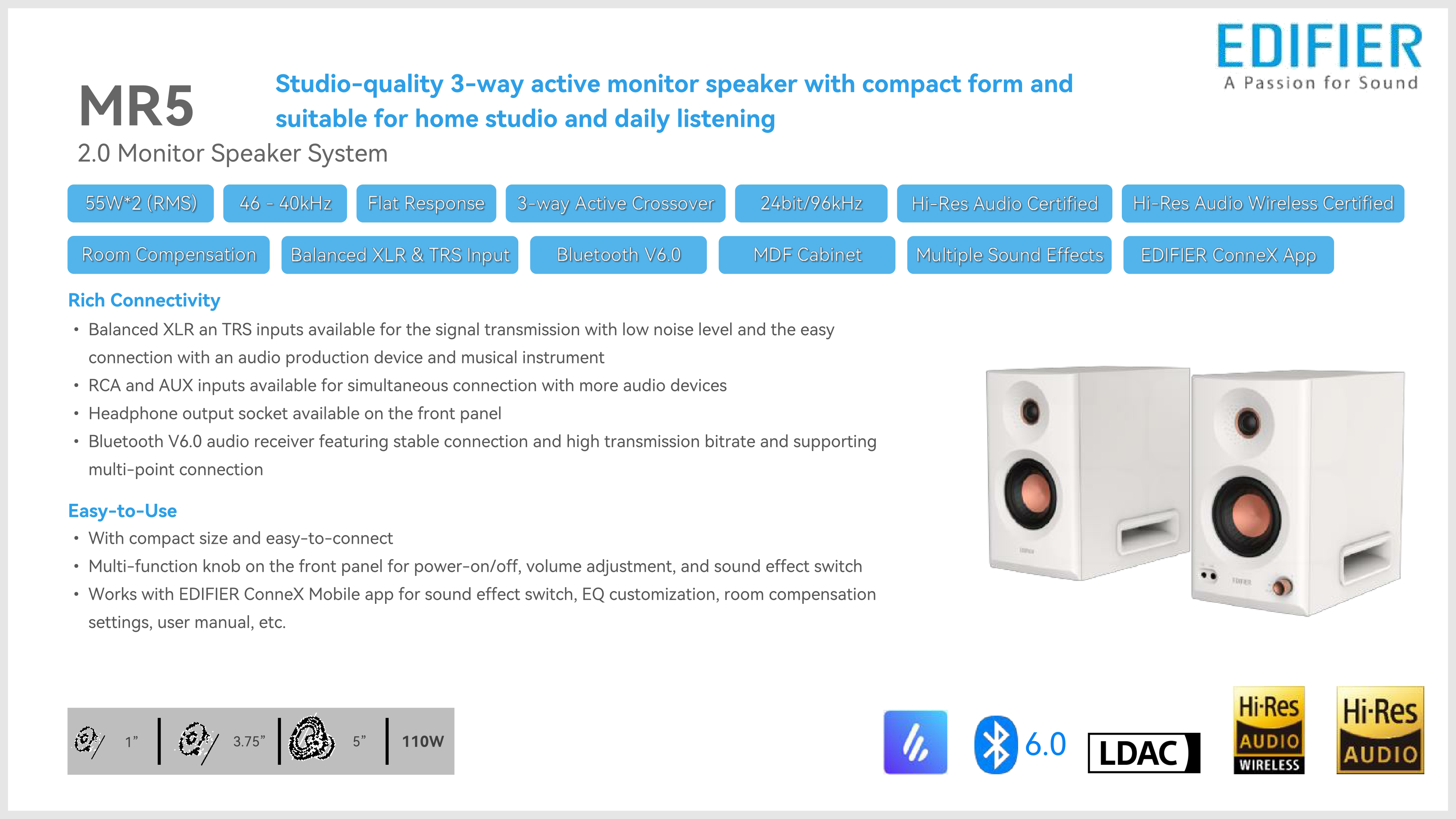 • 提供 110W (RMS) 的總輸出功率和高達 101dB (@1m) 的 SPL,適用於近場聆聽和功能強大,足以填滿普通客廳