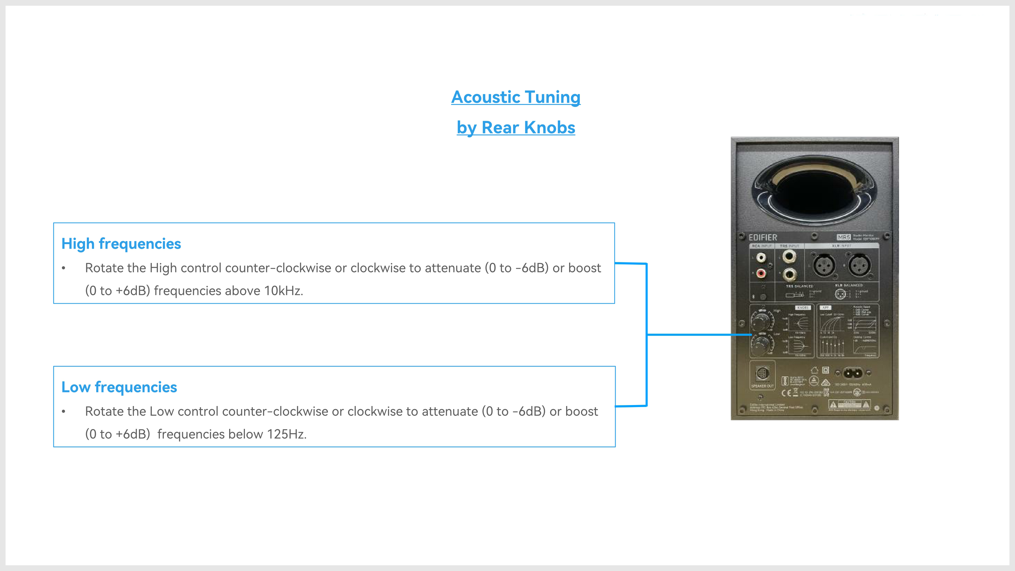• 後旋鈕和手機App提供多種房間補償設置,以適應不同的需求房間模式並實現最佳聆聽體驗