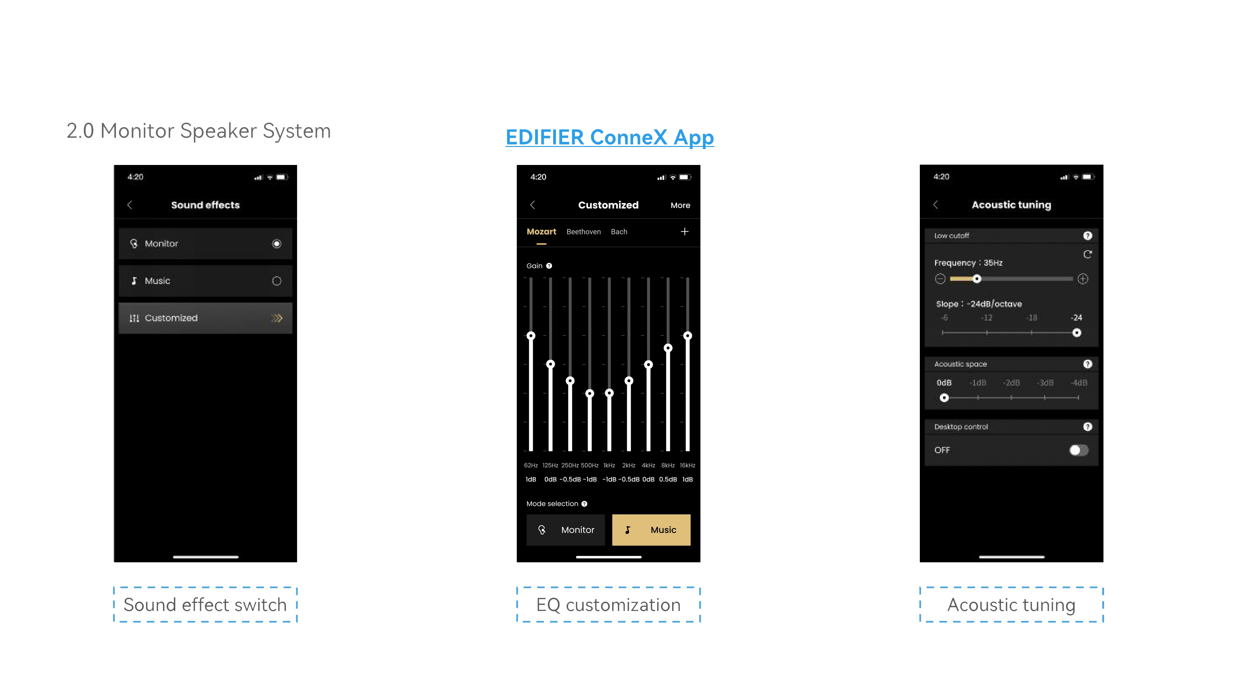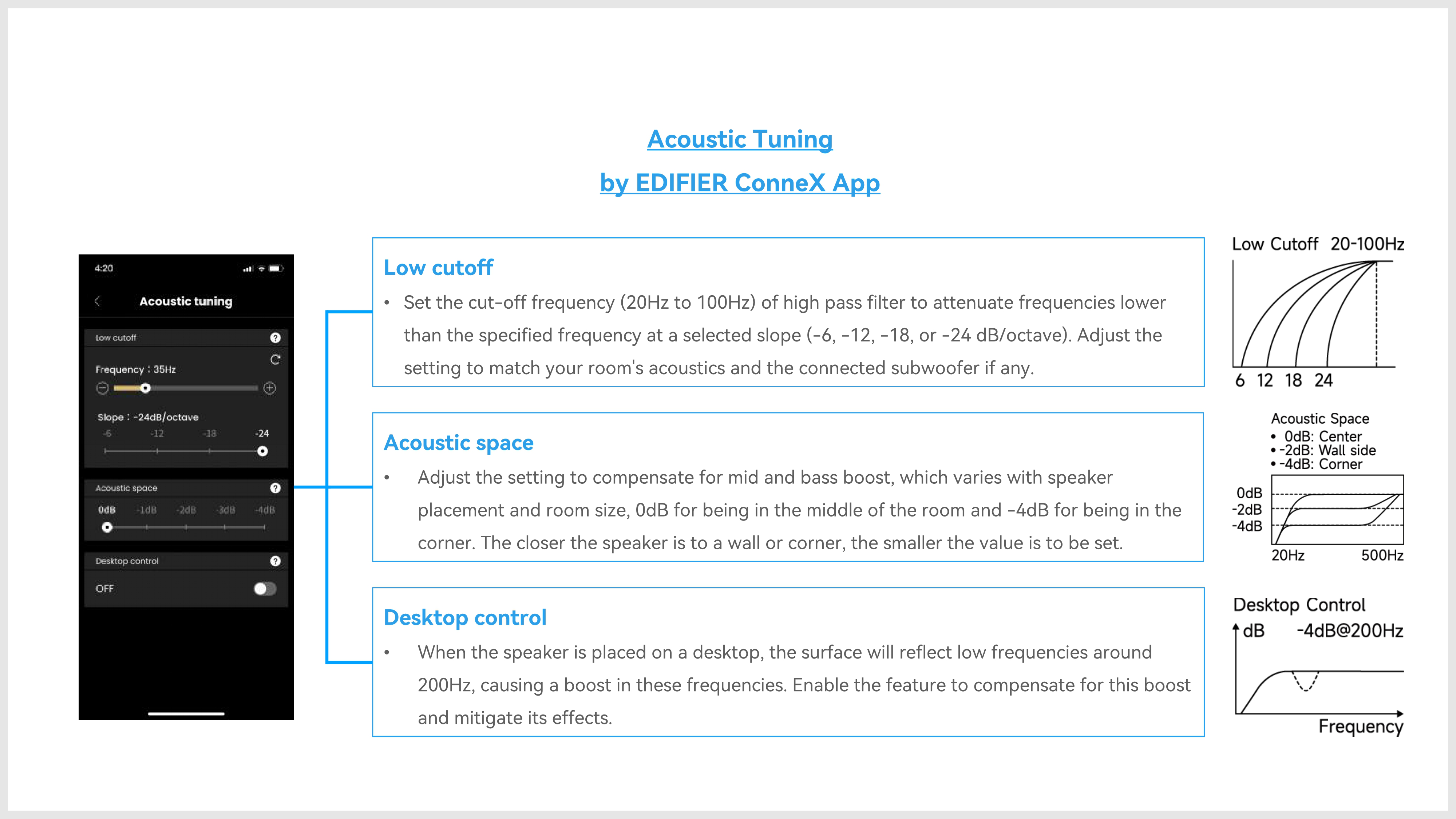 • EDIFIER ConneX App 搭配使用,實現音效切換、EQ 客製化、房間補償設定