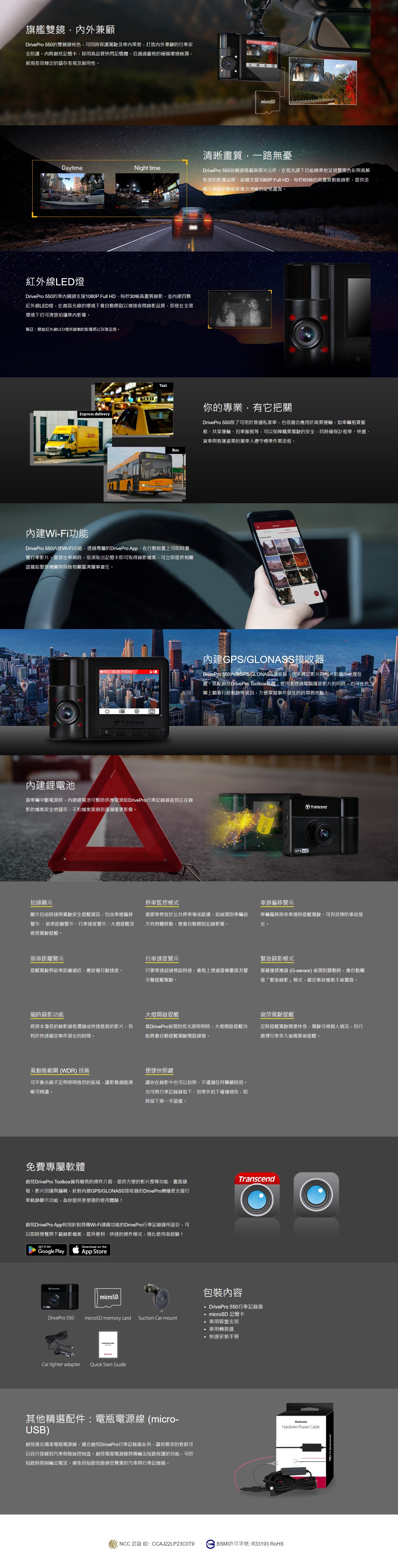 創見DrivePro 550行車記錄器採用一機雙鏡頭設計,打造內外兼顧的行車安全防護。前鏡頭搭配高感光元件及超大視野,以每秒60張的解析度,清楚實錄Full HD 1080p高畫質影片;車內鏡頭則是180度可旋轉式設計,搭配四個紅外線LED燈,在夜間或是低光源下依舊可以清楚錄下車內影像。