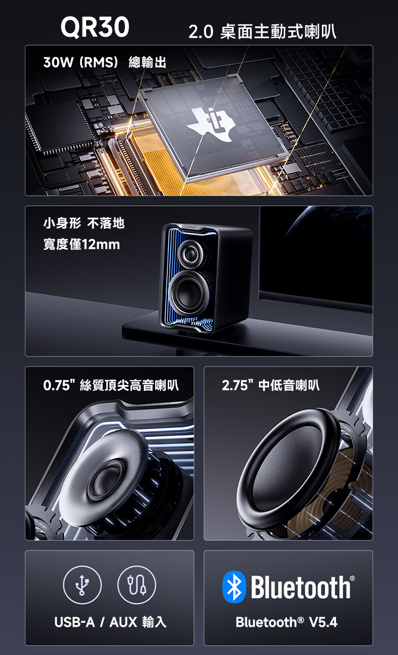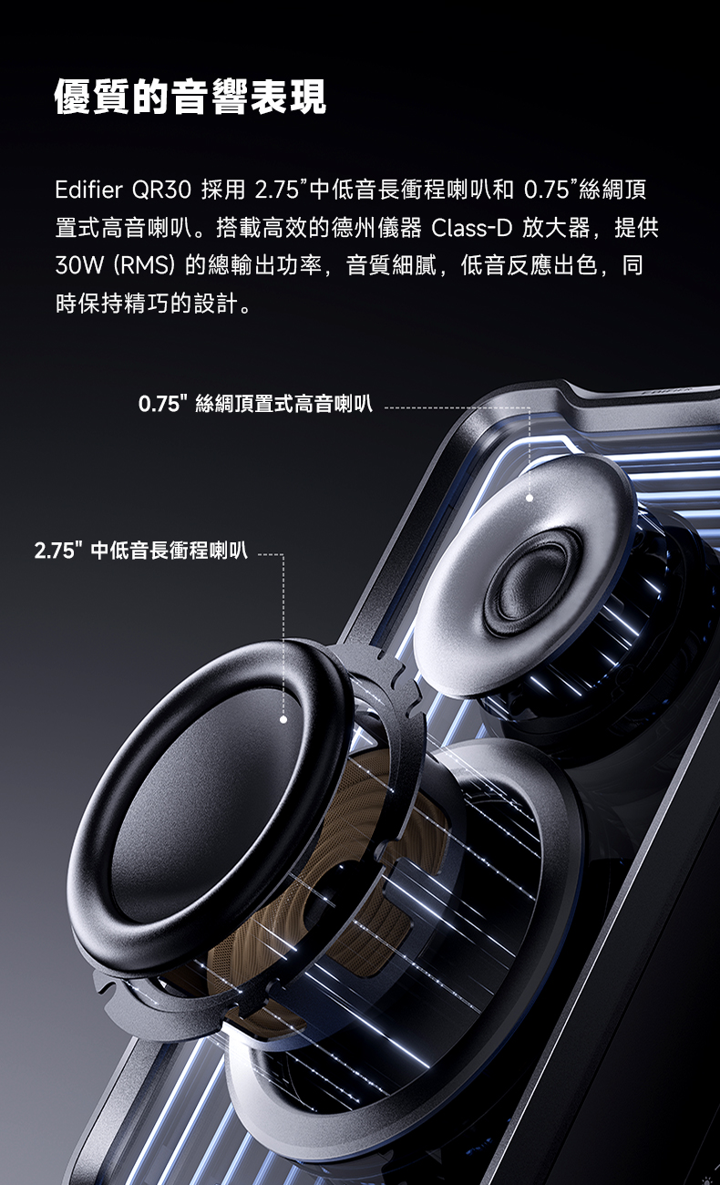 - 配備 0.75″絲頂高音喇叭和 2.75″長衝程中低音喇叭