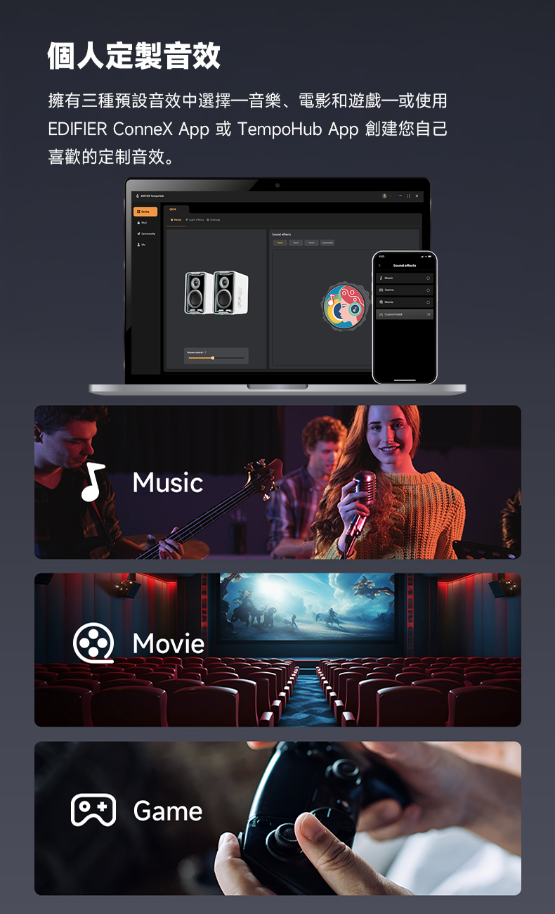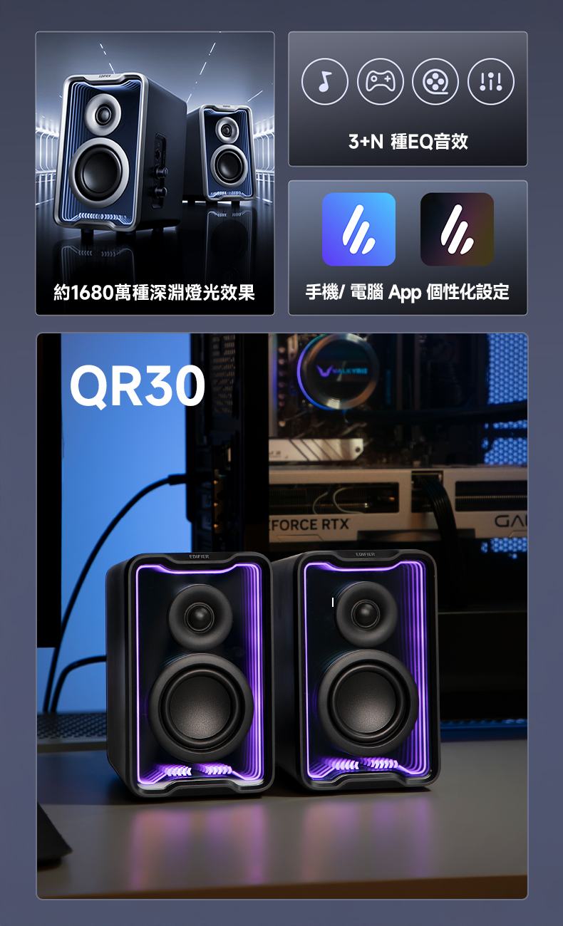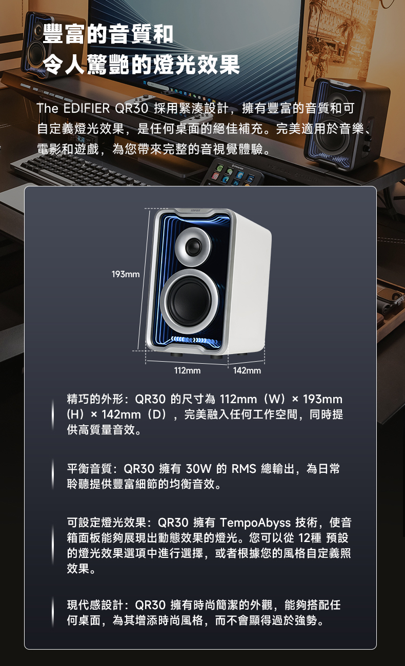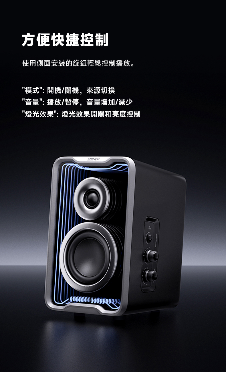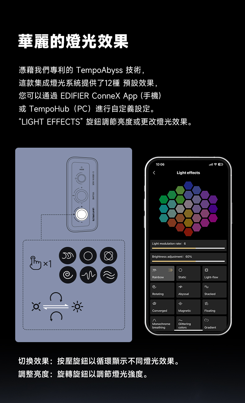 - 憑藉 Edifier TempoAbyss 技術供電,提供數百萬種可定制的燈光效果