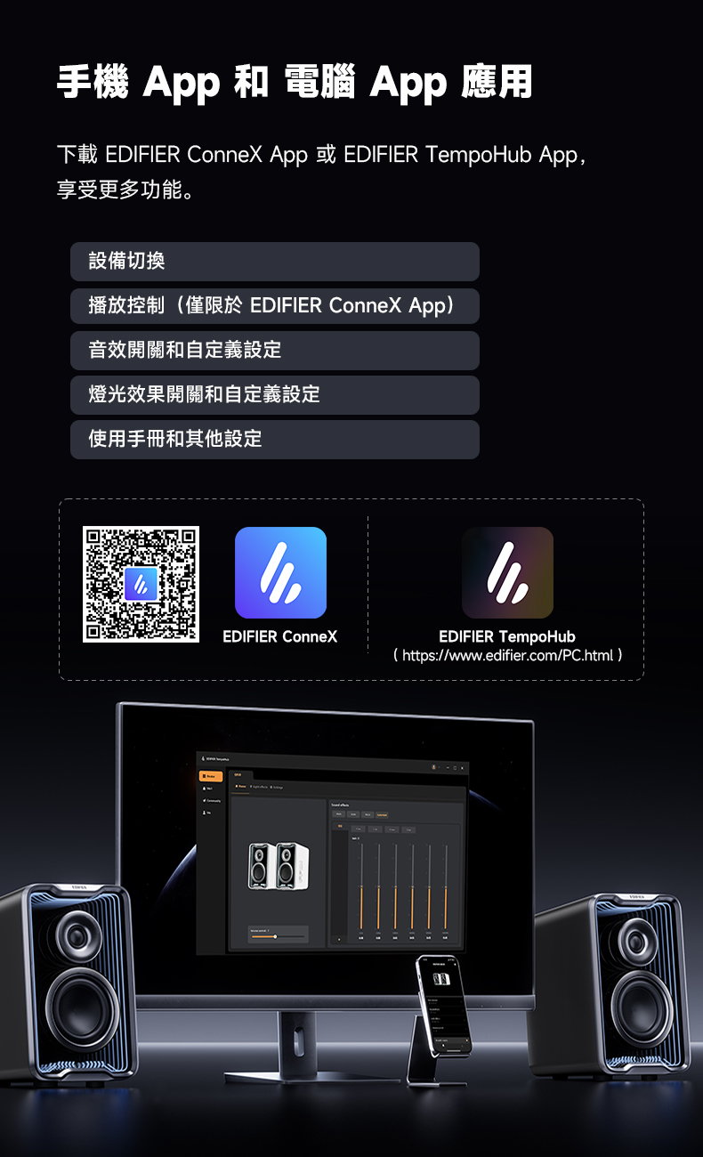 - 兼容 EDIFIER ConneX App 和 EDIFIER TempoHub App