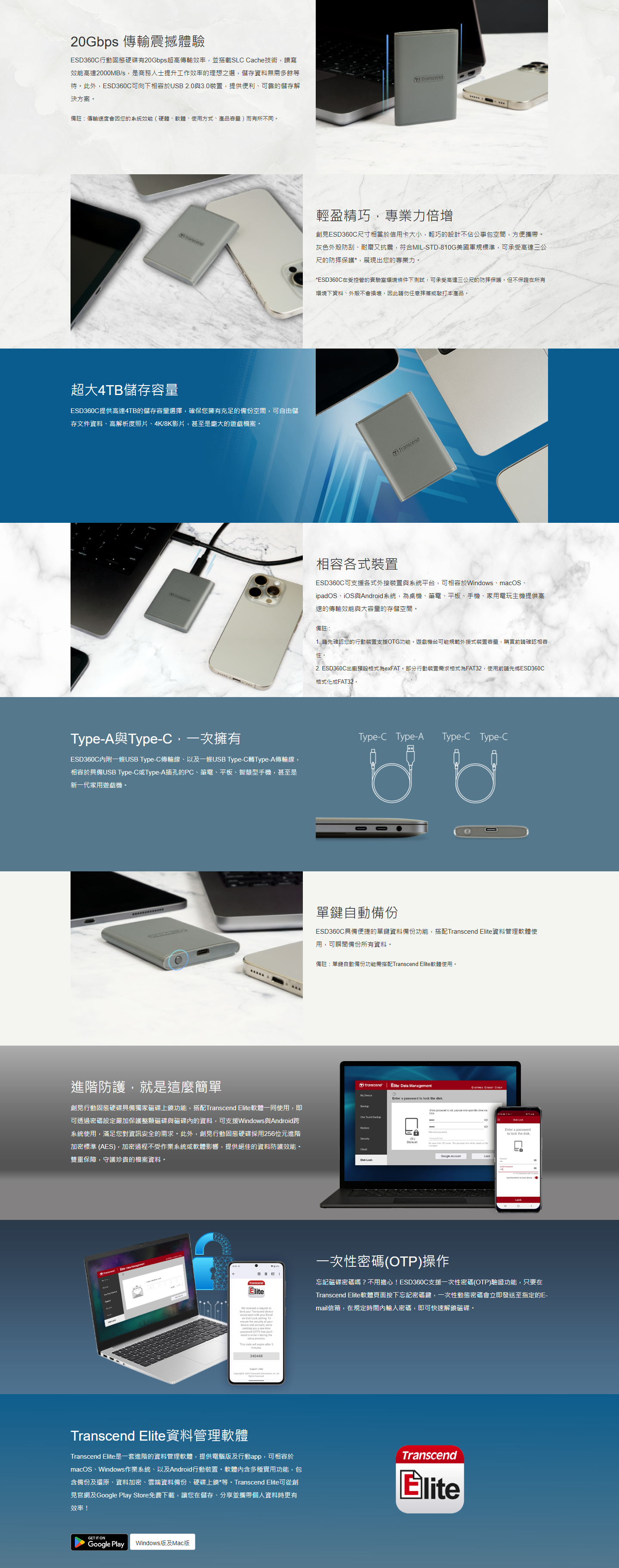 創見ESD360C高速行動固態硬碟,提供USB 20Gbps的傳輸速率,與龐大儲存容量,輕薄尺寸相當於信用卡大小,可塞進皮夾,方便攜帶。ESD360C擁有單鍵備份與進階的資料保護機制,適合儲存重要資料如:客戶資訊、商務合約、會議資料、或是珍貴的影音創作檔案,是時候升級你的移動資料庫了!